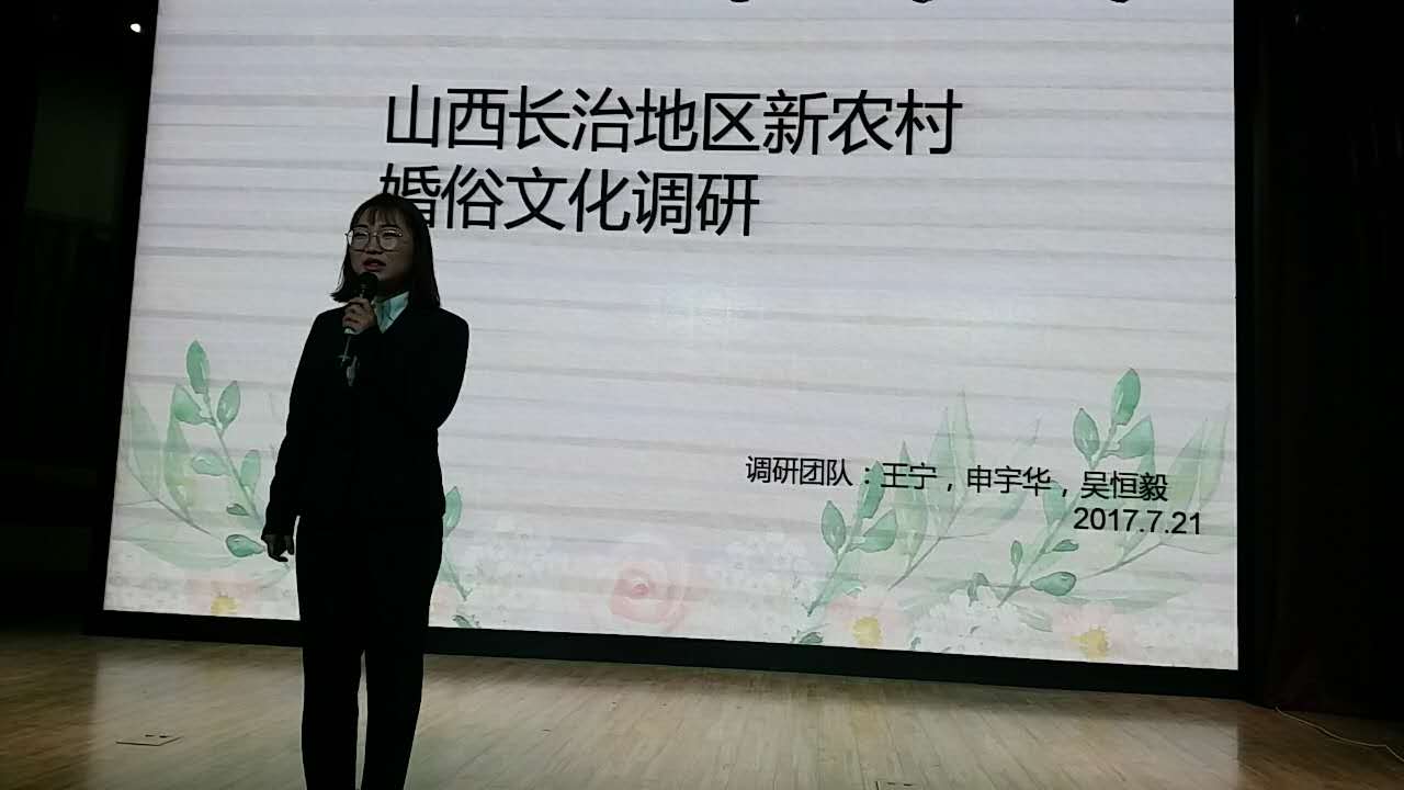 今年我系共有7支团队25人参加“青年服务国家”暑期社会实践活动,奔赴北京、内蒙古、辽宁、山东、安徽等地。实践内容涉及专业调研、文化宣讲、志愿服务、教育帮扶、新农村文化建设等方面,同学们利用暑假深进社会、了解国情、体验社情。在汇报会现场,各团队同学们通过PPT、音频、视频等形式声图并茂地向同学们畅谈自己的感受和心得体会。各小组依次汇报完毕后,张政资团队的“一张家庭照,传递社管情”主题活动获得一等奖;王宁团队“山西长治地区新农村婚俗调研”和“青城山下的朗朗读书声”获得二等奖。闫智维团队“弘扬蒙古族优秀旅游文化”、苑彤彤团队“山东德州婚庆市场调研”、钱政昌团队“婚礼人的梦”、宋宏伟团队“管管爱心志愿团”获得三等奖。