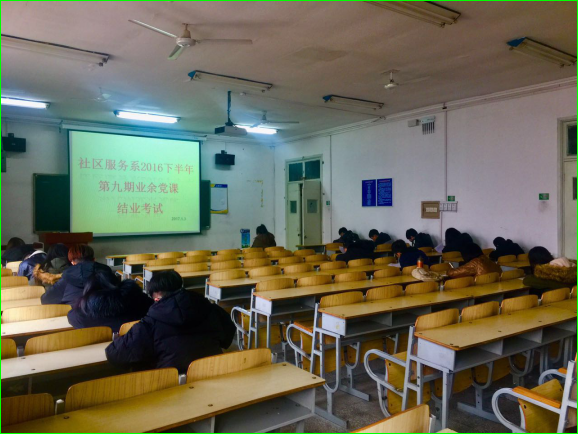根据学院《关于2016年度下半年学生党务工作的通知》要求,进一步加强和改进我院学生党务工作,确保我系学生党员发展质量,按照《社区服务系学生党课教育计划》, 社区服务系党支部历时一周系统组织开展了学生党课专题教育培训与考核工作。经过一周的集中学习,党课结业考试严格有序的组织实施,21名学生于2017年1月3日中午12:20在教学楼310教室进行了党课结业考试。