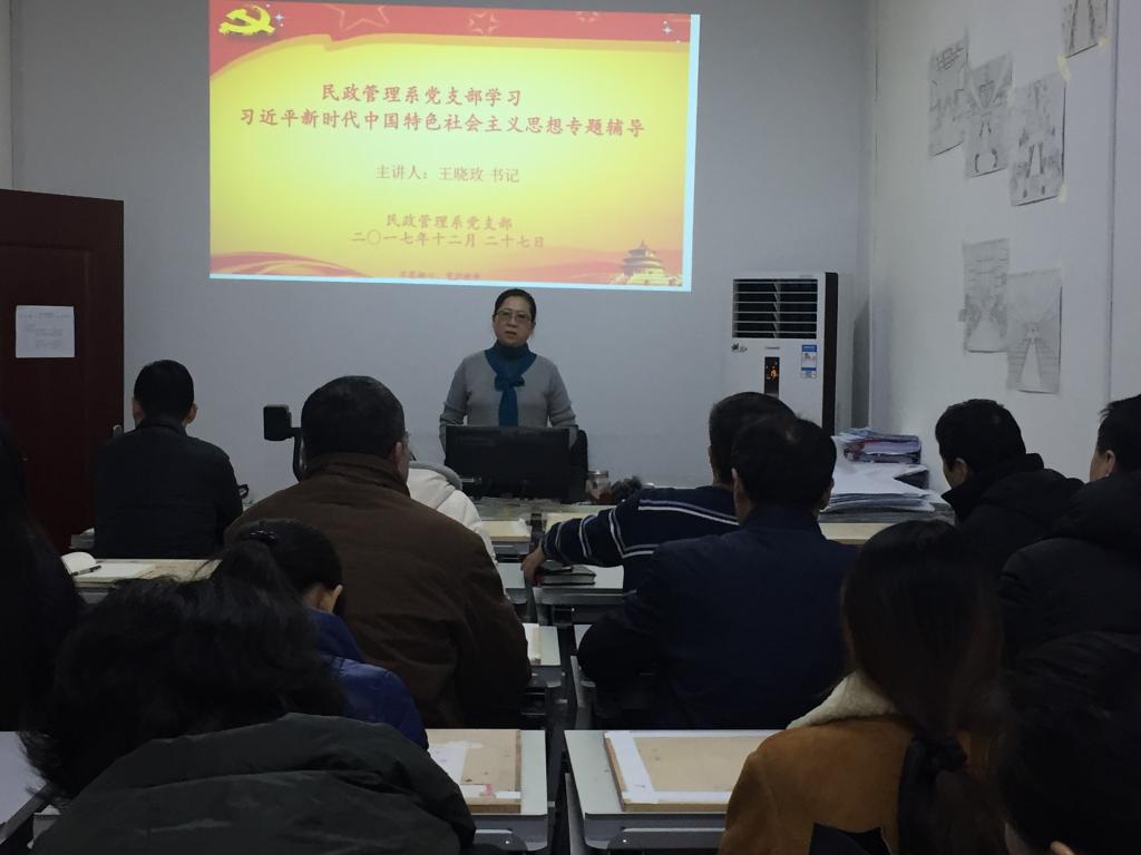 为学习宣传贯彻党的十九大精神,推进“两学一做”学习教育常态化、制度化,根据学院党委关于学习宣传贯彻党的十九大精神工作方案的通知要求,民政管理系2017年12月27日举行习近平新时代中国特色社会主义思想专题党课,系党支部王晓玫书记主讲,支部全体党员参加。