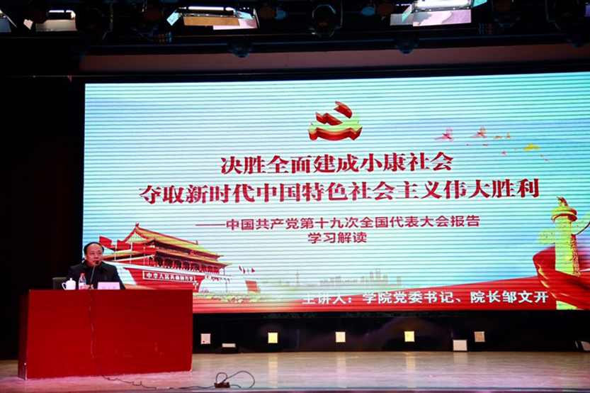 11月21日晚,365体育投注备用网址组织全体团学干部学习贯彻党的十九大精神,党委书记、院长邹文开作题为“决胜全面建设小康社会,夺取新时代中国特色社会主义伟大胜利”主题宣讲,学院300余名团学干部听取宣讲。