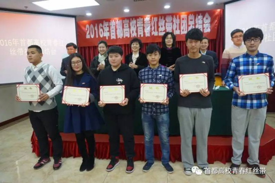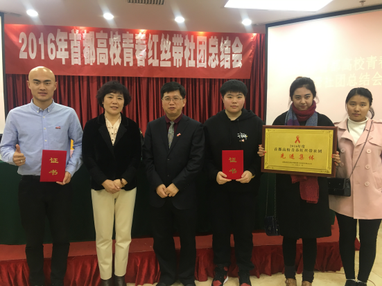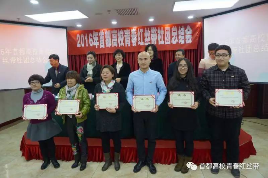 在刚刚结束的2016年首都高校“青春红丝带”社团总结会上。我校荣获2016年首都高校青春红丝带社团“先进集体”,张洪来老师被评为2016年度首都高校青春红丝带社团“优秀指导教师”;我校红丝带学生社团社长来自生命文化学院的宋宇坤同学被评为2016年度首都高校青春红丝带社团“优秀志愿者”等荣誉。