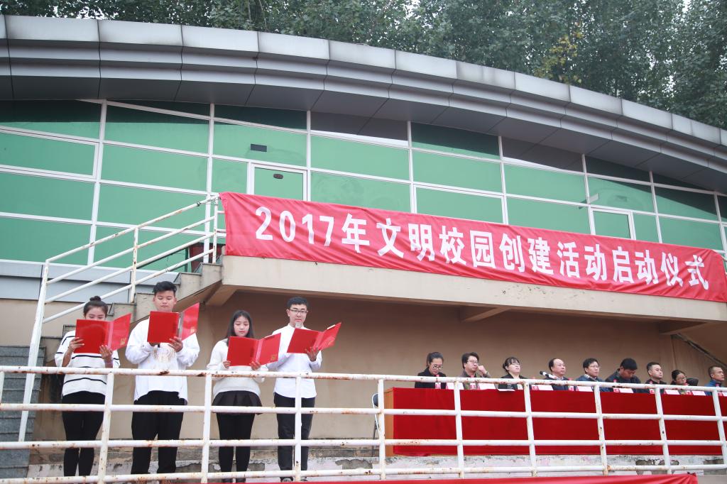 启动仪式上,方新委员介绍了学院关于开展2017文明校园创建和评比活动(学生层面)的相关内容与进度安排以及评比表彰和工作要求;民政管理系1602婚庆班学生宋宏伟同学、社区服务系1601特教班学生崔子豪同学、院学生会主席团储备干部李源同学、生命文化学院徐莉老师、团委委员王慧先老师分别作为学生代表、班级代表、学生组织代表、院系代表以及院团委代表宣读了倡议书;团委委员张洪来进行了“创建文明校园 争做文明学生”领誓,全体学生跟随集体宣誓;校园电视台主持人社团的同学们进行了题为“创建文明校园 争做文明学生”的诗朗诵。