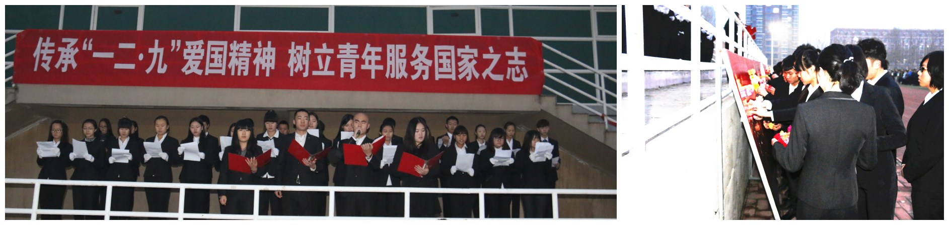 “缅怀一二?九,共抒爱国情”主题团日活动在雄壮的国歌中拉开帷幕,伴随着国歌声,五星红旗冉冉升起。在升旗仪式后,来自于院团委、各学生组织的学生干部代表,进行了朗诵,由各院系团总支书记以及各院系学生干部代表、励志班学生代表组成的56人方队进行了献花仪式,56个人,象征着56个民族,更象征着来自五湖四海的同胞们凝聚一心共同缅怀一二九,朗诵者带着昂扬的腔调、饱满的激情、诉说出无限的青春活力;声情并茂,昭示民政学子爱国之情怀;字正腔圆,尽显社管青年肩负之担当,把内心的情感展现得淋漓尽致,字里行间展现了对祖国的热爱,此时各位献花代表在主席台下用自己手中的鲜花拼出了“缅怀一二?九,共抒爱国情”来表达此刻的心情。